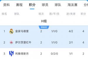 在H組積分榜上,皇馬暫時排名小組第一,同積4分的薩爾茨堡紅牛凈勝球劣勢緊隨其后,利雅得新月2連平暫居小組第3,兩連敗的帕丘卡則提前一輪小組出局。