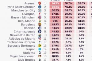 體育資訊10月21日訊 歐冠聯賽階段第三輪開賽在即,opta超級計算機更新了歐冠奪冠概率,其中阿森納位列榜首,巴黎、曼城分列二三。