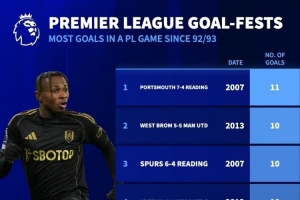 富勒姆vs曼城出現(xiàn)9粒進球,英超歷史單場比賽進球第7多