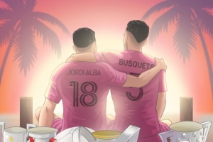 美職聯(lián)曬海報致敬阿爾巴、布斯克茨:懷抱獎杯并肩策馬,步入夕陽