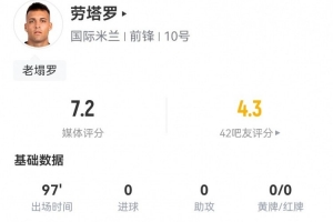 體育資訊7月1日訊 國米在世俱杯16強戰0-2不敵弗魯米嫩塞,勞塔羅本場數據如下: