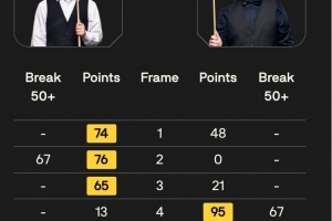 開場后袁思俊連勝三局并在第二局中打出單桿67分,第四局本·沃拉斯頓打出單桿67分扳回一城,第五局袁思俊打出單桿63分鎖定勝局。