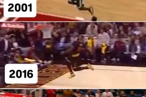 詹姆斯轉發了媒體發布的他分別在2001年、2016年及2026年完成招牌式搶斷后大風車扣籃對比畫面。