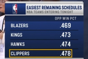 快船主場迎戰(zhàn)黃蜂,轉(zhuǎn)播方給出一項統(tǒng)計,剩余對手勝率排名,快船第四輕松。