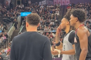 比賽當中,火箭球員阿門死死貼防馬刺后衛卡斯爾,對手與主帥米奇溝通時,阿門也在旁邊,并且不忘與卡斯爾交流一波。