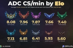 體育資訊3月9日訊 外媒統計單排各分段ADC玩家分均補刀: