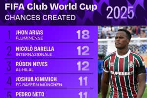 體育資訊7月11日訊 本屆世俱杯僅剩巴黎vs切爾西的決賽,數據機構squakwa也統計了本屆賽事創造機會情況,弗魯米嫩塞的27歲前鋒瓊-阿里亞斯獨自領跑。