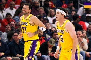 賽后湖人官推發布贏球海報,封面為東契奇和里夫斯。