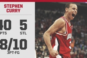 本場比賽,當時效力于戴維森學院的庫里出戰(zhàn)39分鐘,22投14中,三分球10中8、罰球6中4,砍下40分3籃板2助攻5搶斷,其中下半場則是貢獻30分。