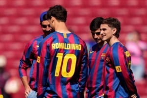 巴薩球員賽前身穿羅納爾迪尼奧的球衣踩場,向這位巴薩傳奇球星致敬,因為昨天是羅納爾迪尼奧的46歲生日。