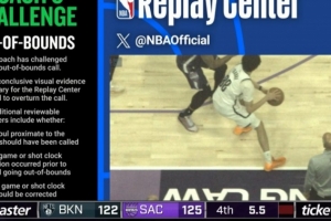 特拉奧雷被兩位裁判同時(shí)吹踩線和進(jìn)攻犯規(guī),籃網(wǎng)挑戰(zhàn)失敗,裁判回放后明顯踩線,還是國(guó)王球權(quán)