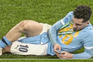 在賽后,曼城球星謝爾基側(cè)躺在球場(chǎng)內(nèi)玩手機(jī),十分放松。