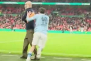 在裁判吹響終場哨后,謝爾基從替補席沖入球場慶祝,進場前還“偷襲”式的推了瓜迪奧拉一把,瓜帥則一臉懵的回頭看了謝爾基一眼。