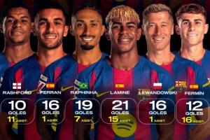 體育資訊03月23日訊 世體統(tǒng)計(jì)了巴薩球員本賽季的進(jìn)球貢獻(xiàn)數(shù)據(jù),亞馬爾以21球15助排在第一位,費(fèi)爾明12球16助第二,拉菲尼亞19球7助第三。