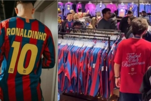 在周日對陣賽前,巴薩球員全員身著印有羅納爾迪尼奧10號的2005/06賽季巴黎歐冠決賽版球衣亮相,這一致敬經典的舉動迅速點燃了球迷的購買欲。