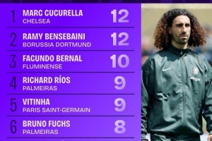 體育資訊7月15日訊 Squawka統計了世俱杯賽事攔截次數排名,庫庫雷利亞和本塞拜尼12次并列第一。