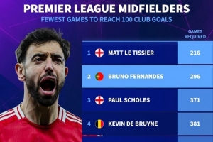 據德國轉會市場統計,B費已為曼聯打進100球,英超時代只有8名中場球員為俱樂部(所有賽事)打進100球,而B費是所用場次第2少的中場球員。